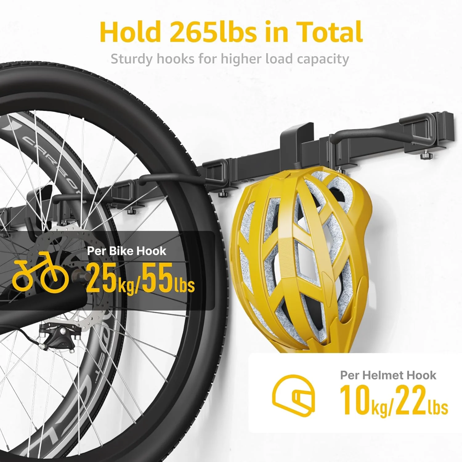 - ăSTURDY & DURABLE STRUCTIONă Discover the unbeatable strength and longevity of monTEK's Bike Wall Mount. Engineered from premium steel, its unique and robust structure guarantees exceptional durability. Unlike other market wall bike rack prone to bending, our garage bike rack promises peace of mind by preventing bent rails, bike drops, or wall damage. With each bike hanger able to support up to 55 lbs and each helmet hook bearing 22 lbs, our bike wall hanger supports a total of 265 lbs, providing a secure and reliable storage solution you can trust.