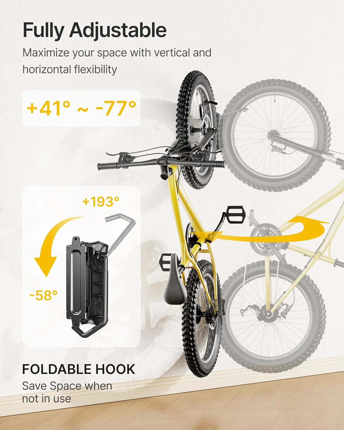- Swiveling & Folding – Total Storage Flexibility : Featuring an upgraded swivel mechanism, this bike wall mount offers a wide +41° to -77° swivel range. Effortlessly position your bike center, left, or right to navigate tight spaces—ideal for parking next to cars or in compact apartments. When not in use, the rack folds nearly flat (-58° to +193° tilt), providing a truly versatile and space-saving storage solution.