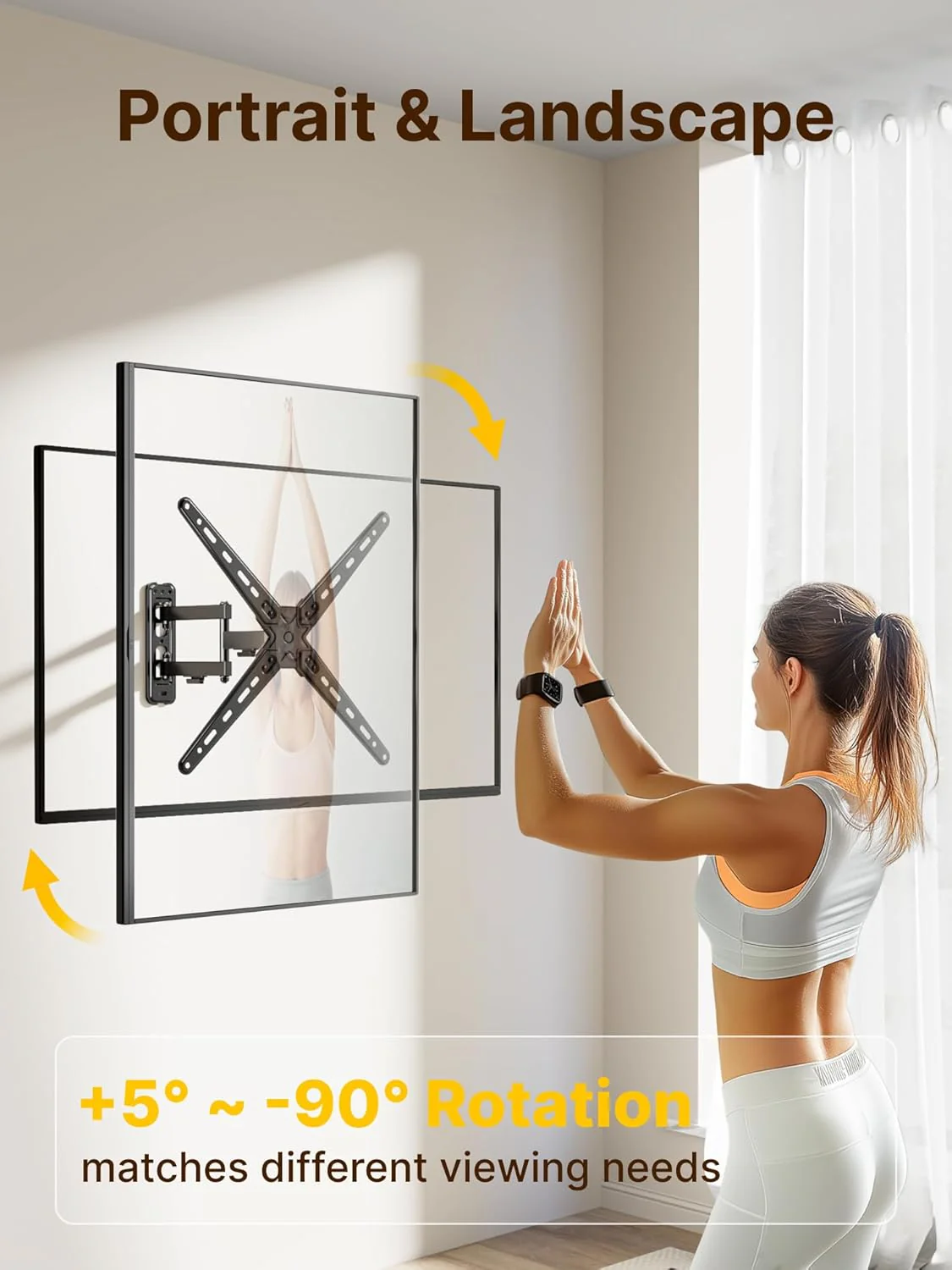 - SPACE-SAVING & ULTRA SAFE DESIGN- Enjoy a neat and orderly viewing experience with our TV mount. TV wall mount can pull out to 14.4"or retract back to 2.6" from the wall. You can fold to tuck-in closely to the wall when TV left unused. Its built-in cable management design can effectively hide and organize all cables, keeping your space neat and orderly. Wall -mounting TV in home theater also protects family safety from TV tip-over, it works perfect as corner TV mount, living room, bedroom, kitchen, studio, office, etc.