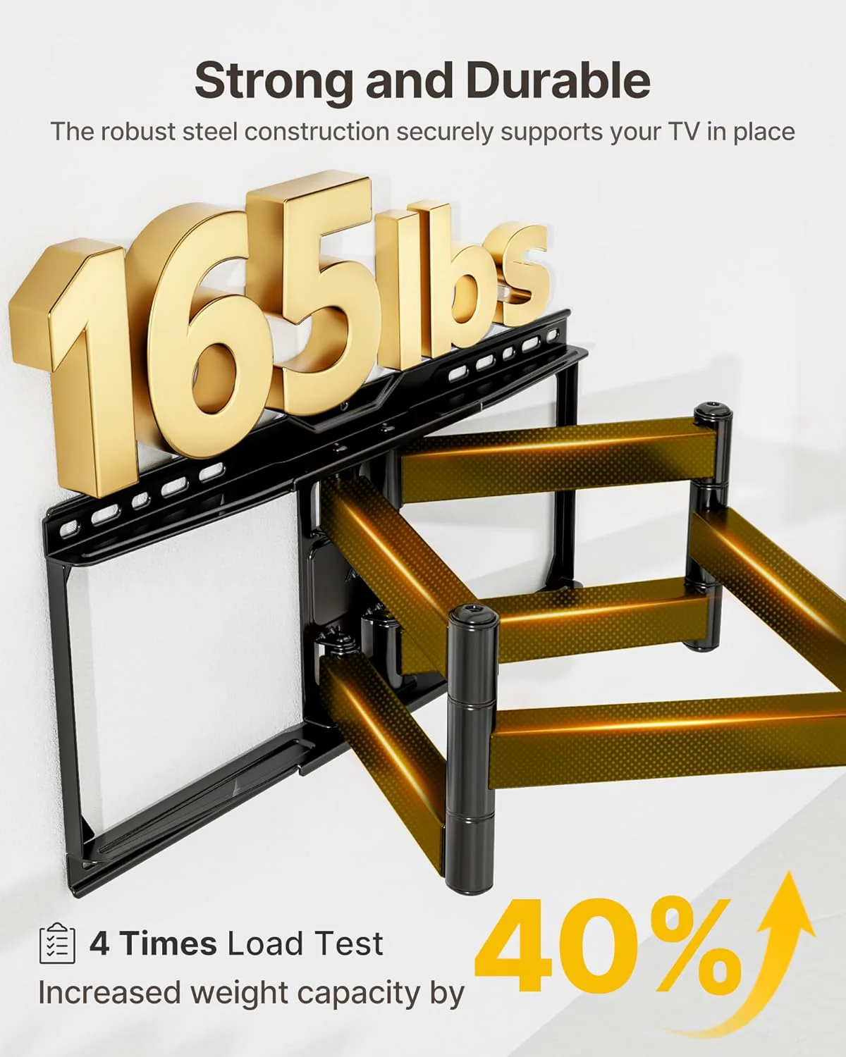 - ăUNMATCHED STRENGTH & 4X LOAD TESTEDă Built for serious strength, the monTEK heavy duty tv wall mount holds 37â90 inch large TVs weighing up to 165lbs. Featuring 40% reinforced dual arms, 4X load testing and 25.1" long extension, it ensures unmatched stability. Whether you're upgrading your living room, building an immersive home theater, setting up a gaming zone, or enhancing a conference room, this tv wall mount delivers professional-grade performance in any space