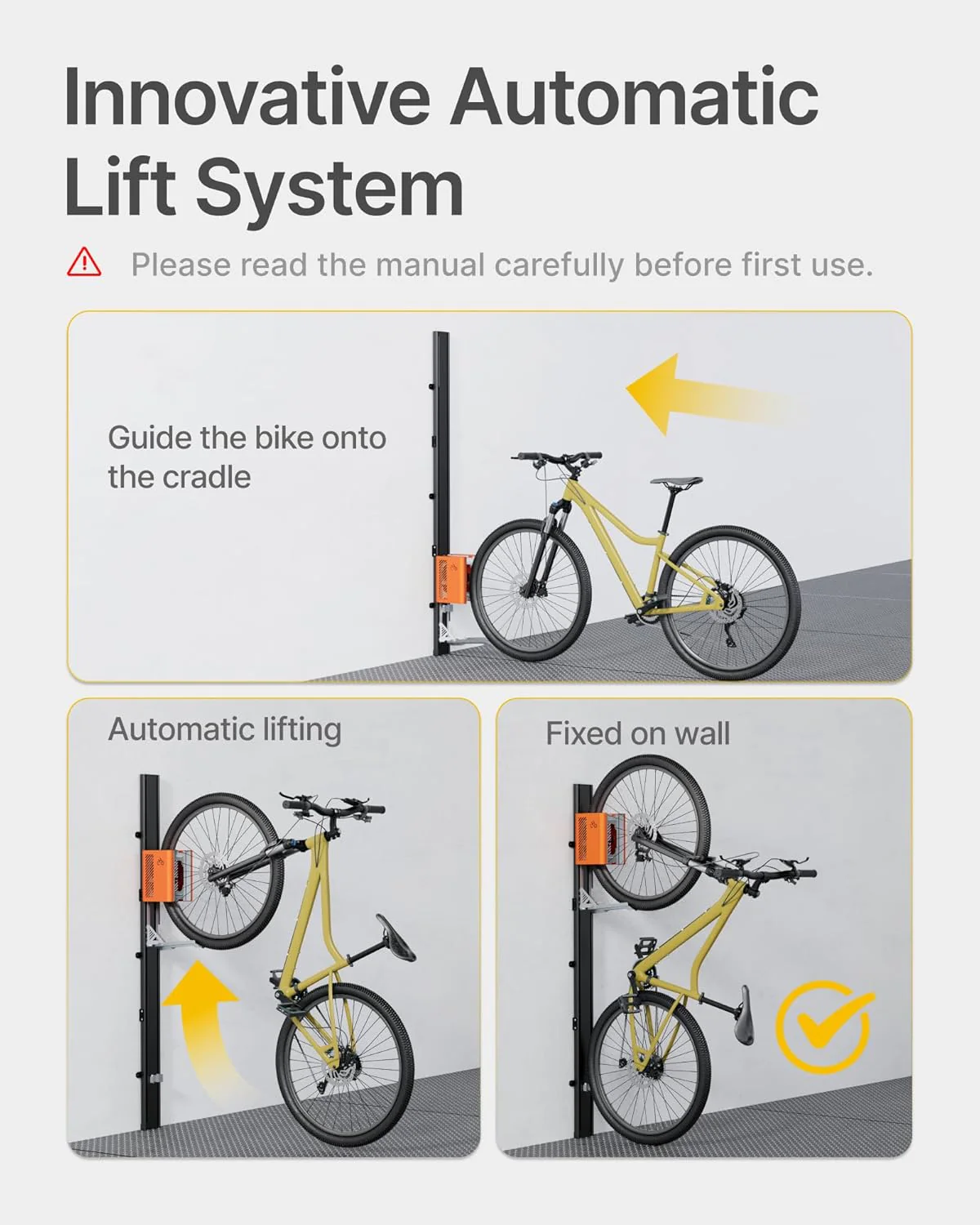 - QUICK AND EASY SETUP: Installing this automatic lift electric bike rack is quick and easy. No need for complex tools or professional skills. With simple, clear instructions, you can have your bike lift securely mounted in minutes. Ideal for those who value efficiency and simplicity