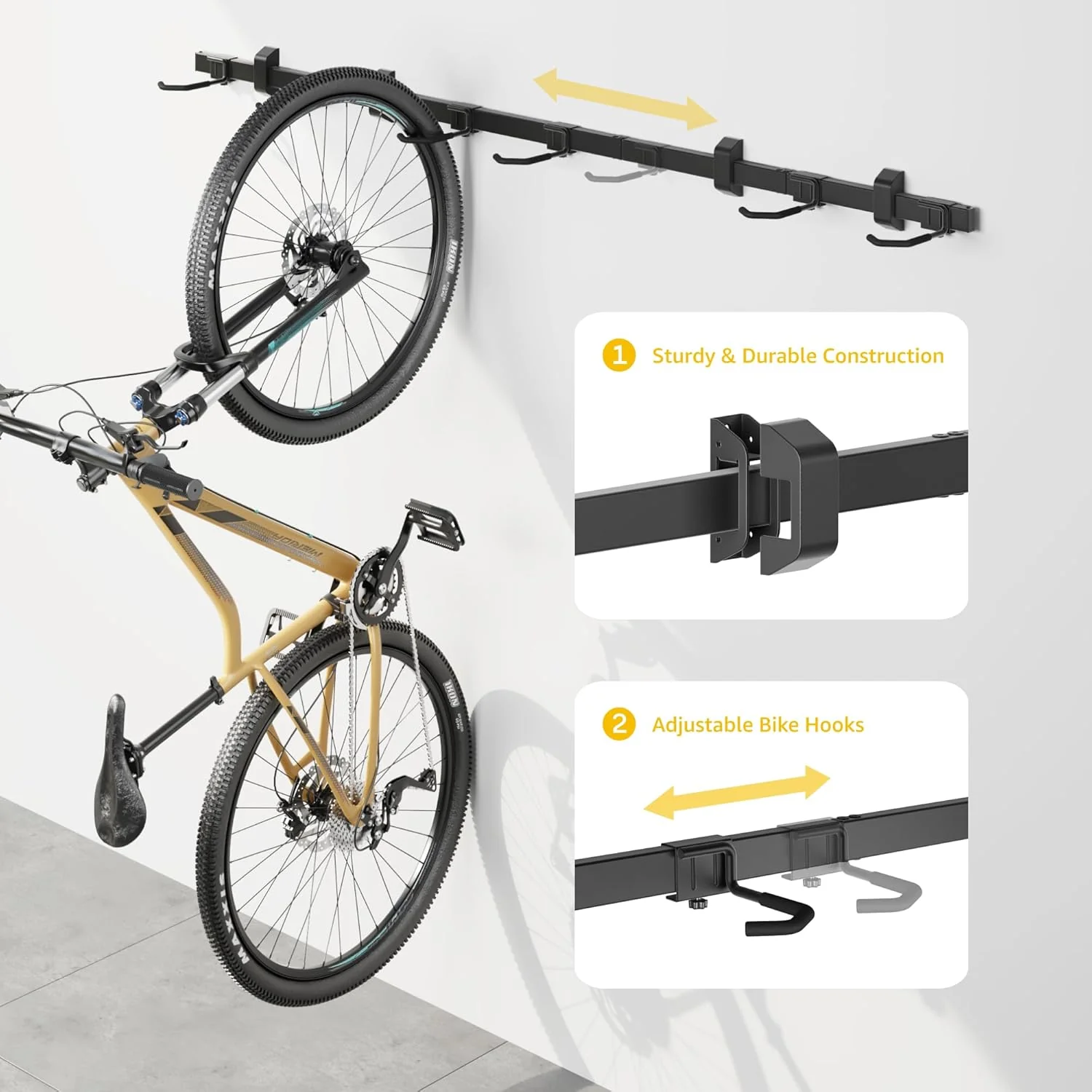 - ăEFFICIENT BICYCLE STORAGEă Equipped with 6 bike hangers on an extended 78.5-inch rail, the monTEK wall-mounted bike rack garage surpasses standard lengths on the market, ensuring spacious and tidy bike storage. By lifting the bicycles off the ground, it liberates valuable floor space in your garage, making organization and cleaning a breeze. Exceptional space-saving benefits make it the perfect choice for garages, storage rooms, apartments, and beyond. The monTEK garage bike rack wall mount - the ideal solution for streamlined bike organization!