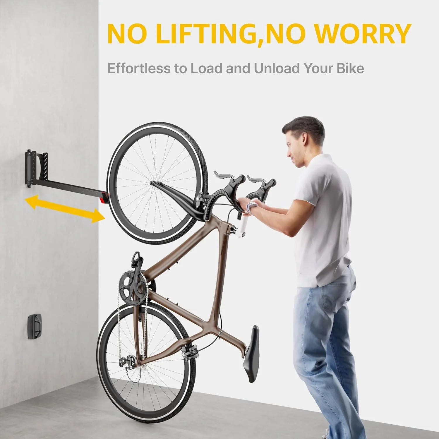 - ăNO HEAVY LIFTINGăEnjoy a hassle-free bike storage experience with our Easy-Load Bike Wall Mount. No more struggling with heavy lifting! All you need to do, is balance your bike on its rear wheel and smoothly roll it into the rack. When not in use, our bicycle wall mount can be folded, saving valuable space. Make storage a breeze with our Easy-Load Bike Wall Hanger! Please NOTE: our no lifting bike wall mount is not suitable for bikes with fenders.