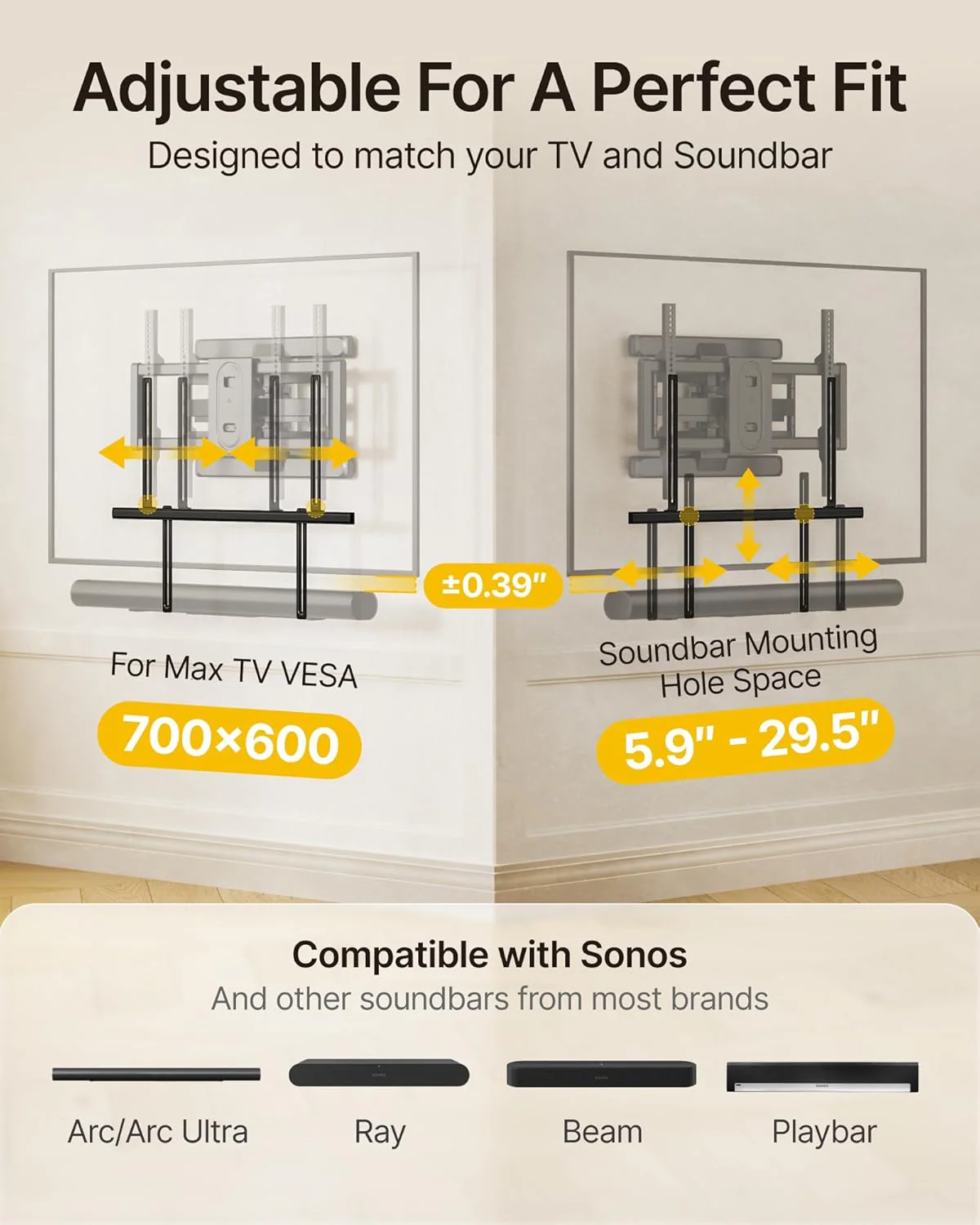 - ăPerfect Audio-Visual ExperienceăSoundbar TV mount seamlessly attaches your soundbar beneath your TV, saving space. The included Velcro help organize cables for a tidier setup. With the soundbar shelf, your soundbar moves with your TV, delivering an optimal viewing and listening experience from any angle.
